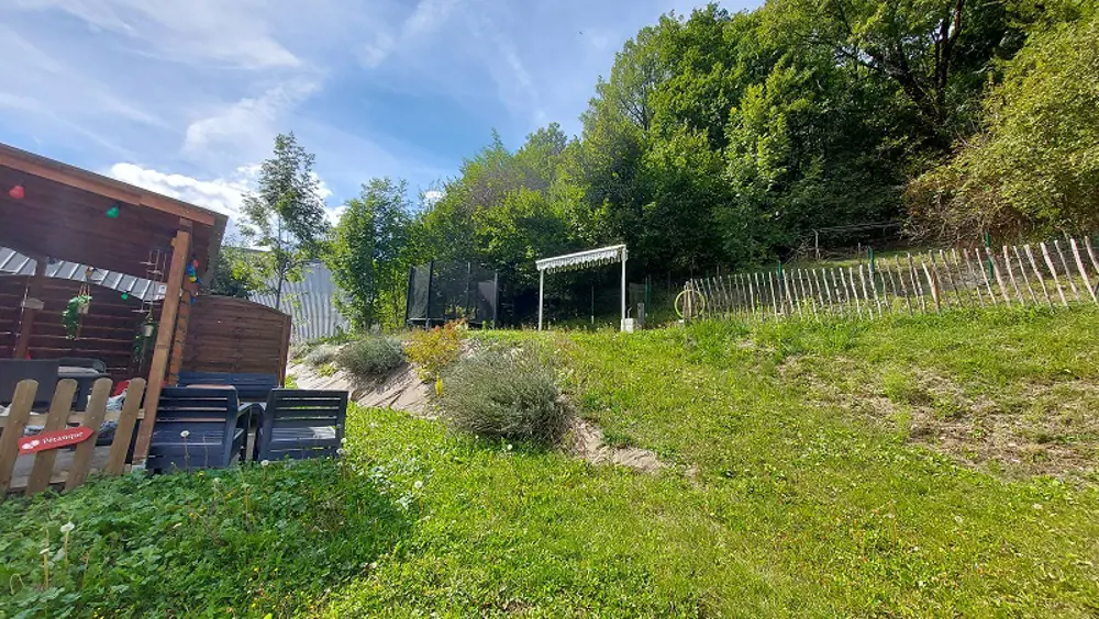 Un jardin se trouve à l'arrière de la maison avec terrasse couverte, terrain de boules et abri de jardin.