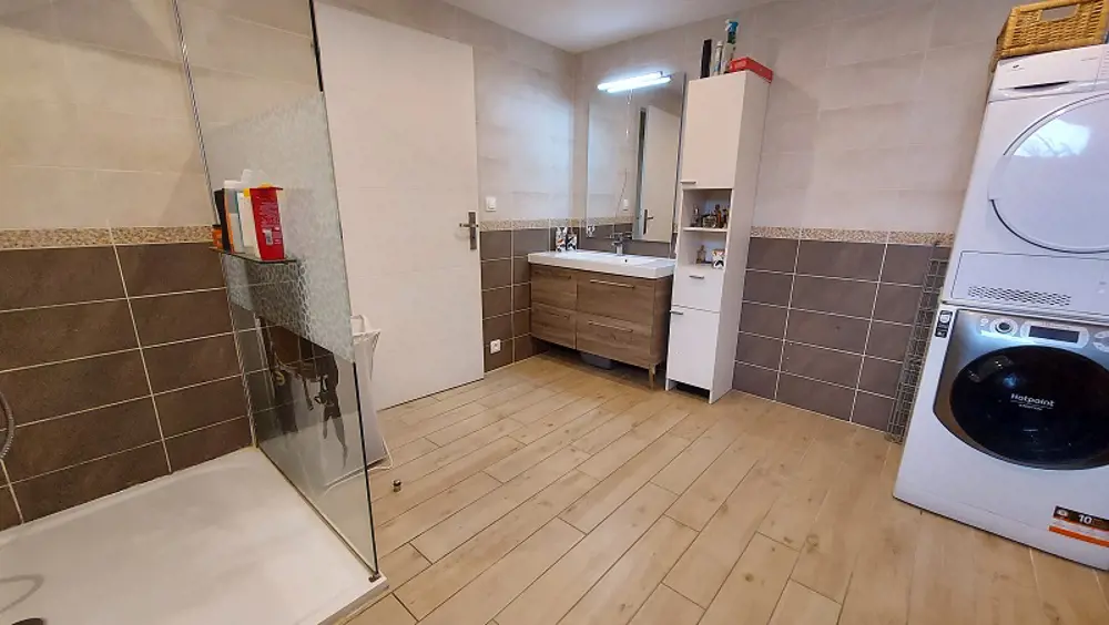 Au rdc une pièce de vie spacieuse donnant sur une cuisine ouverte, un wc-cellier et une grande cave.