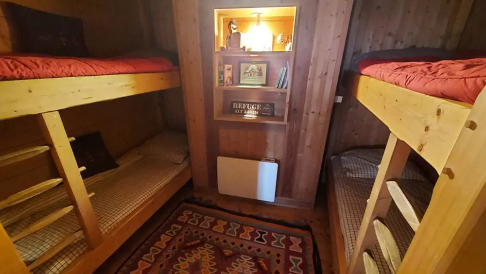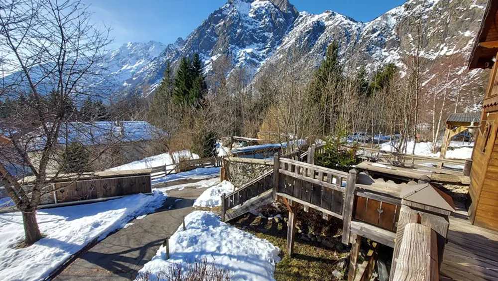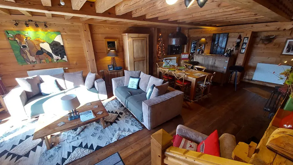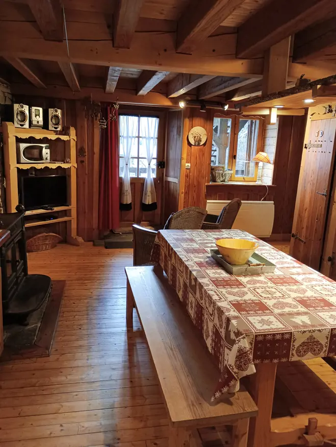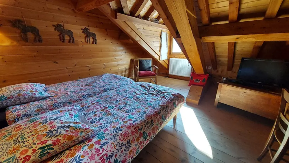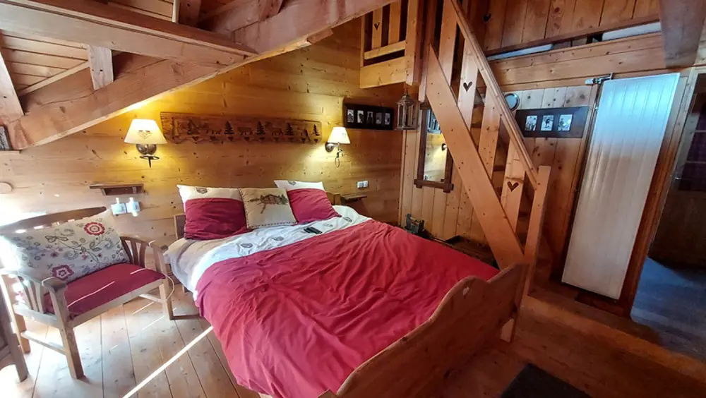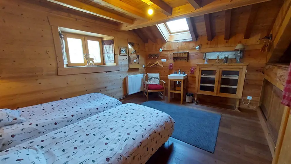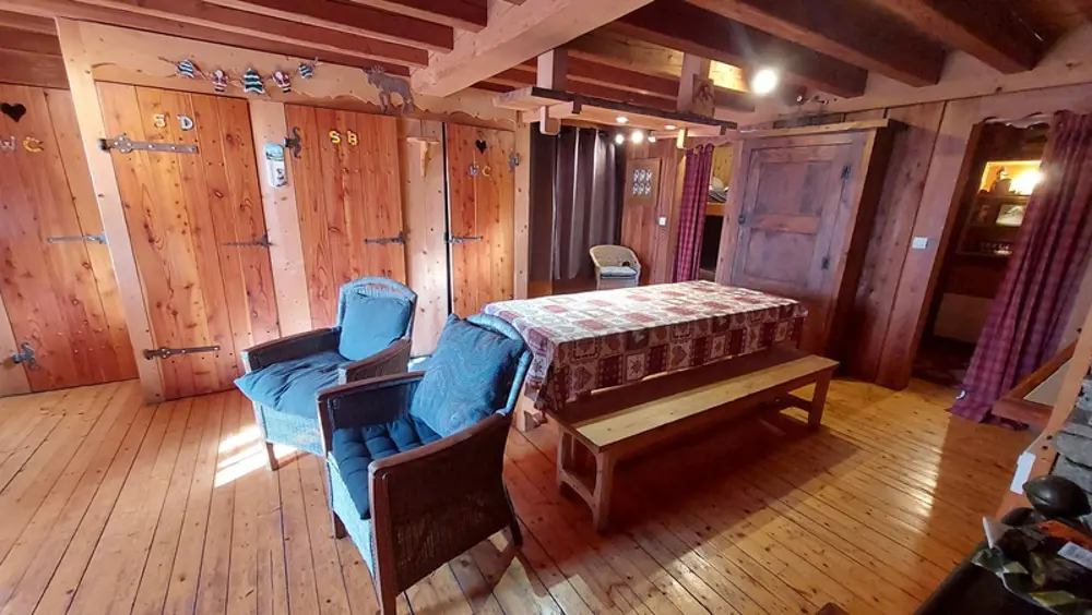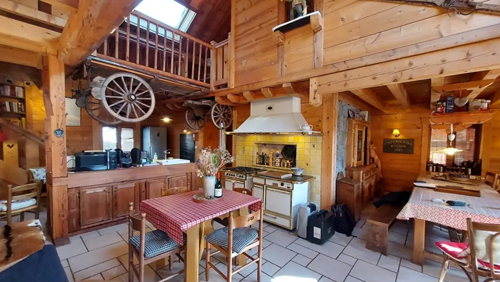 On the chalet side, located on the first floor, there is a spacious living/dining room opening onto a pleasant terrace, a large fully equipped kitchen, a bathroom and a WC. On the second floor, there are four bedrooms and a mezzanine.