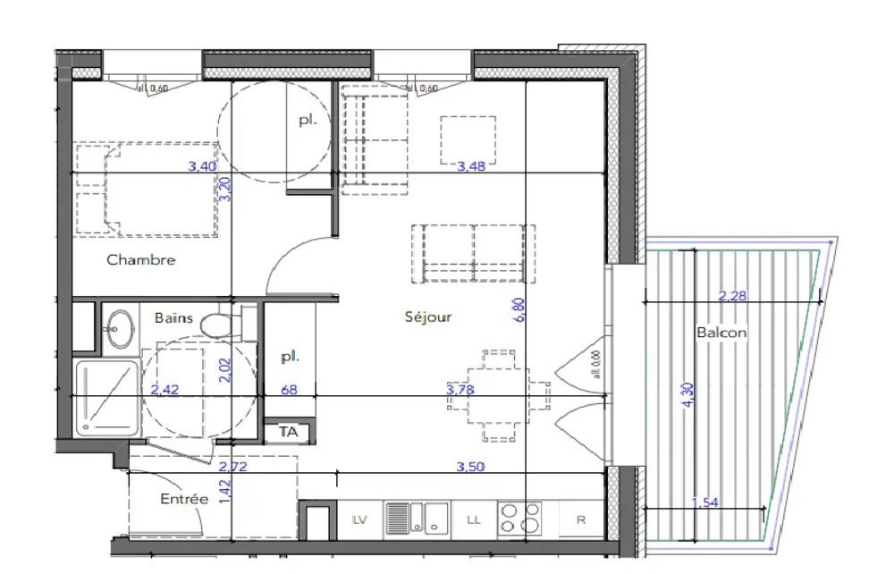 Cet appartement a une surface de 44 m² avec un balcon de 8,22 m² exposé est.